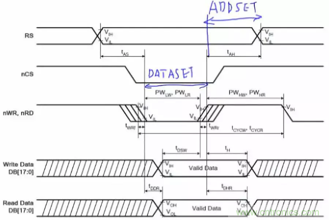 而ADDSET指的是地址建立時(shí)間,指的是片選之后到讀/寫操作之前的時(shí)間,這是針對SRAM來說的,如果操縱的是TFT,不存在地址線,所以此時(shí)的ADDSET就是讀/寫信號結(jié)束到RS電平的轉(zhuǎn)換時(shí)間。