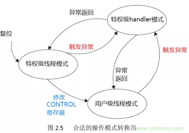 處理器也有兩種特權(quán)分級:特權(quán)級和用戶級。 這張圖說明了一切:復(fù)位進(jìn)入特權(quán)級線程模式,如果有異常,進(jìn)入特權(quán)級的handler模式處理異?;蛑袛嗬?,然后返回至特權(quán)級線程模式。通過修改CONTROL寄存器可以進(jìn)入用戶級線程模式。