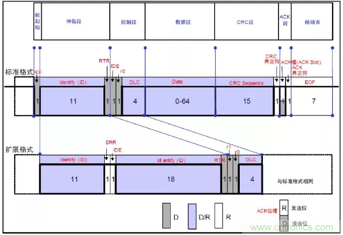 47、CAN協(xié)議的有5種類型的幀:數(shù)據(jù)幀、遙控幀、錯(cuò)誤幀、過載幀、幀間隔。其中前兩種幀有標(biāo)準(zhǔn)格式(11位ID)和擴(kuò)展格式(29位ID)。