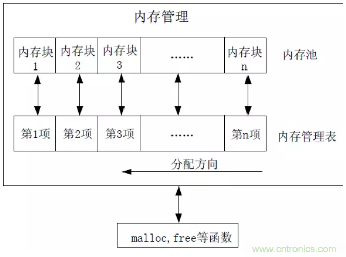 注意表中的分配方向,從頂?shù)降?。每一?xiàng)對應(yīng)一個(gè)內(nèi)存塊。里面的數(shù)值代表了內(nèi)存池的狀態(tài):如果為0,表示該內(nèi)存沒有被分配;如果非0,那么數(shù)值的大小就表示了該塊內(nèi)存被連續(xù)占用的內(nèi)存數(shù)。