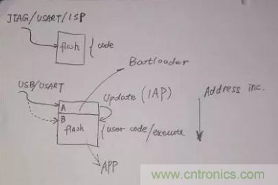 而在IAP編程中,flash被分區(qū)為A和B兩個(gè)區(qū)域,A區(qū)域只允許用USB/USART等方式下載,此區(qū)域作為更新B區(qū)域的代碼用。