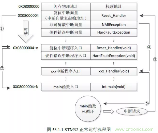 上圖表示STM32正常運(yùn)行的流程圖,可以看到上電復(fù)位后系統(tǒng)從0x80000004處開始運(yùn)行程序,這里放置的是復(fù)位中斷向量,然后跳轉(zhuǎn)至復(fù)位中斷程序入口后再跳轉(zhuǎn)至main函數(shù)運(yùn)行用戶的程序。