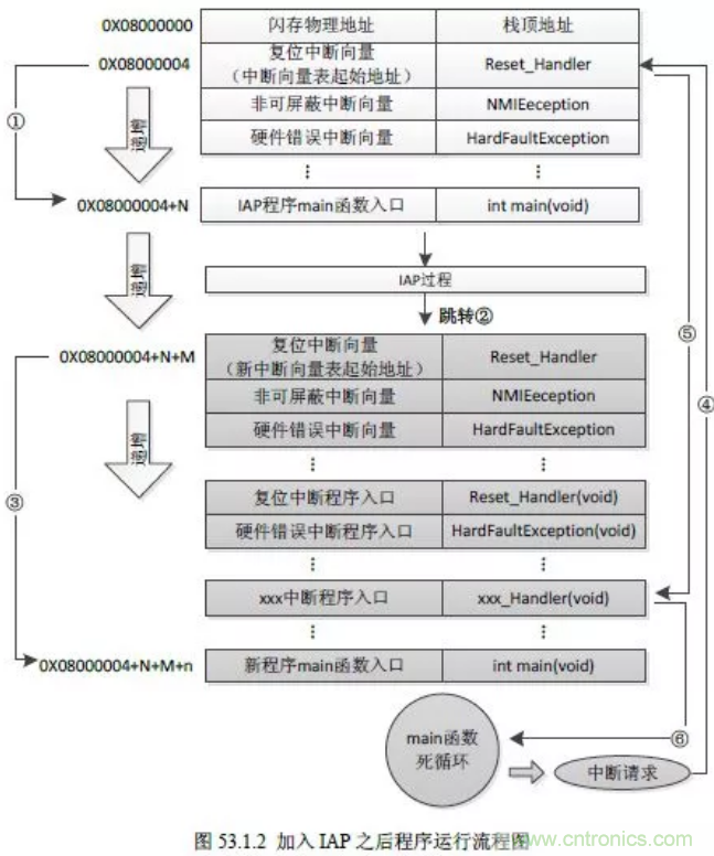 后面的過程和STM32正常運(yùn)行一樣,如果出現(xiàn)中斷請求,還是跳轉(zhuǎn)到A區(qū)域中的中斷向量表中,然后再跳轉(zhuǎn)到B區(qū)域的中斷服務(wù)入口。