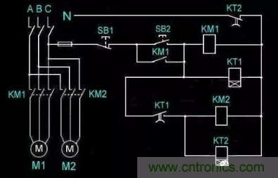 各個引腳的含義我們已經(jīng)搞清楚了,下面就可以根據(jù)控制原因進(jìn)行接線,我們以下圖為例,在電路中加入KT通電延時時間繼電器,當(dāng)按下啟動按鈕SB2線圈KT1、KM1得電交流接觸器KM1吸合,電動機M1轉(zhuǎn)動,延時閉合開關(guān)KT1到達(dá)時間吸合,KM2、KT2得電,交流接觸器KM2得電吸合,電動機M2轉(zhuǎn)動,延時斷開開關(guān)KT2在到達(dá)時間以后斷開,整個控制回路斷開,所有電機停止轉(zhuǎn)動;