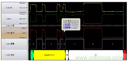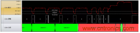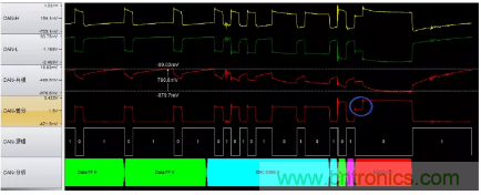 圖6波特率異常(位寬度從2us突然變成1.6us),導(dǎo)致位錯(cuò)誤引起錯(cuò)誤幀。位寬的不穩(wěn)定是波特率不穩(wěn)定導(dǎo)致的,最有可能的原因是晶振問題,建議更換晶振測試。