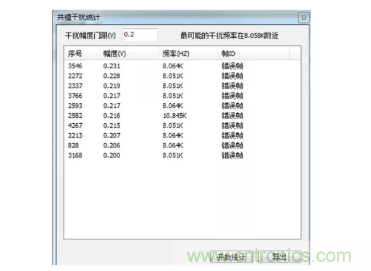 圖3錯(cuò)誤幀是在幀結(jié)束位置出現(xiàn)電平臺(tái)階。此錯(cuò)誤由主動(dòng)錯(cuò)誤標(biāo)志+錯(cuò)誤標(biāo)志疊加而成,二次抬高的是 6 個(gè)連續(xù)顯性電平,因某節(jié)點(diǎn)錯(cuò)誤后全局通知,各節(jié)點(diǎn)錯(cuò)誤標(biāo)志疊加造成的。通常,當(dāng)節(jié)點(diǎn)受較強(qiáng)的電磁場干擾后易發(fā)生此類錯(cuò)誤,如變頻器、逆變器、電機(jī)等功率器件。此時(shí),我們亦可配合FFT分析工具分析干擾頻點(diǎn),以此定位到干擾源并屏蔽它,如圖4。