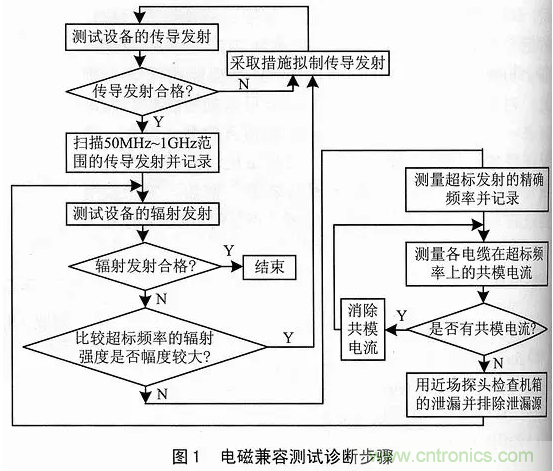 圖1給出了一個(gè)設(shè)備或系統(tǒng)的電磁干擾發(fā)射與故障分析步驟。按照這個(gè)步驟進(jìn)行,可以提高測試診斷的效率。