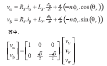 最新無傳感器算法基于如圖1所示的永磁同步電機(jī)的簡化模型,電機(jī)繞組反電勢波形為轉(zhuǎn)子角度的正弦函數(shù),因而能夠用于測量轉(zhuǎn)子角度。通過測量外加定子電壓時(shí)流入定子線圈的電流可以計(jì)算反電勢。為簡化數(shù)學(xué)運(yùn)算,可以利用 Clarke變換將三相電路變換為兩相等效模型,這樣就可以用轉(zhuǎn)子角度的正弦和余弦函數(shù)表示反電勢,其等效電路可以由以下方程描述: