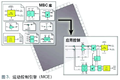無傳感器磁場定向控制算法能夠以全新的控制器體系結(jié)構(gòu)實(shí)現(xiàn)。圖2中所示控制系統(tǒng)的每個(gè)功能都可以用硬件宏模塊實(shí)現(xiàn),而不是軟件。諸如比例積分控制、矢量旋轉(zhuǎn)和Clarke變換等功能可共用于所有交流電機(jī)控制系統(tǒng)。如圖3所示,運(yùn)動(dòng)控制引擎(Motion Control Engine)庫中包含交流電機(jī)控制模塊和其它通用模塊。獲取電機(jī)控制芯片,就能夠取得MCE庫,以及模擬輸入和空間矢量PWM控制等功能。開發(fā)人員可以使用圖形工具將元件從MCE庫拖入自己的控制系統(tǒng)設(shè)計(jì),然后利用圖形編譯器將控制設(shè)計(jì)翻譯為MCE序列指令,以正確順序連接硬件宏模塊從而實(shí)現(xiàn)自己的控制系統(tǒng)。該方法可以不必在開發(fā)過程中進(jìn)行軟件編碼,既能節(jié)省時(shí)間,又能減少錯(cuò)誤。