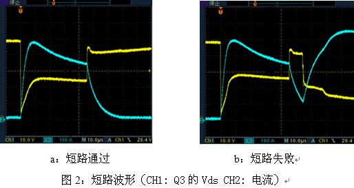 當(dāng)控制器工作時,如電機(jī)短路,則會形成如圖1中所示的流經(jīng)Q2,Q3的短路電流,其電流值很大,達(dá)幾百安培,MOSFET的瞬態(tài)溫升很大,這種情況下應(yīng)及時保護(hù),否則會使MOSFET結(jié)點溫度過高而使MOSFET損壞。短路時Q3電壓和電流波形如圖2所示。圖2a中的MOSFET能承受45us的大電流短路,而圖2b中的MOSFET不能承受45us的大電流短路,當(dāng)脈沖45us關(guān)斷后,Vds回升,由于溫度過高,僅經(jīng)過10us的時間MOSFET便短路,Vds迅速下降,短路電流迅速上升。由圖2我們可以看出短路時峰值電流達(dá)500A,這是由于短路時MOSFET直接將電源正負(fù)極短路,回路阻抗是導(dǎo)線,PCB走線及MOSFET的Rds(on)之和,其數(shù)值很小,一般為幾十毫歐至幾百毫歐。