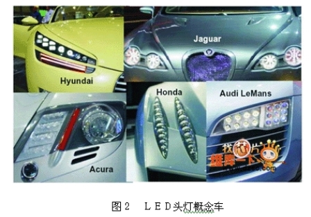 從LED的應(yīng)用歷史來看,早在1992年時已經(jīng)有LED應(yīng)用于第三剎車燈上的先例;而在2000年時則進一步的應(yīng)用于尾燈、轉(zhuǎn)向燈與剎車燈;到了2002年Audi?。粒嘎氏葘ⅲ蹋牛墓庠粗糜谇爸脽艟邇?nèi)作為日行燈,開啟了設(shè)計師與工程師們在前置燈具的想象空間。在之后的許多國際車展上都可以看到LED作為前照燈源的概念車,如圖2所示。