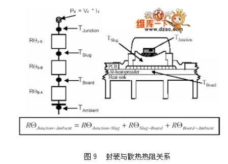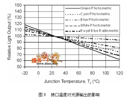 散熱設(shè)計是LED光源區(qū)別于傳統(tǒng)光源的課題之一。傳統(tǒng)燈具產(chǎn)生的熱遠高于LED,但傳統(tǒng)燈具不會因為高溫而降低其光源輸出能力,但LED的光輸出卻會隨著本身接口(Junction,?。校谓涌冢囟鹊纳叨陆?,如圖8所示。而其產(chǎn)生的熱如何散除到外界環(huán)境與其封裝結(jié)構(gòu)材料息息相關(guān),牽涉到使用的散熱材料與相關(guān)外型,關(guān)系如圖9所示,其中熱阻的概念,代表輸入W功率時,需要提高多少K溫度才足以散熱。以現(xiàn)有的封裝技術(shù)最高可允許LED操作在185℃(Lumiled K2),但一般因為封裝膠材的關(guān)系,可允許的操作溫度約在125℃,除了考慮光源輸出效率之外,亦考慮封裝膠材的變質(zhì)(樹脂類材料在高溫有老化現(xiàn)象)。