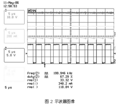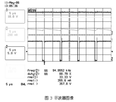 圖 2 、圖3 及表 2、表3 顯示了這種電路在90 ~265 VAC的通用輸入電壓范圍內(nèi),以350 mA驅(qū)動兩個有6個串聯(lián)LUXEON FLOOD 25-0032 HB-LED板時的結(jié)果。表 2 顯示了在輸入電壓范圍內(nèi)良好的電流調(diào)節(jié)。圖 2 和圖3 說明了正如理論所示的,由于占空比較小,輸入電壓較高時紋波較差。這表明在主電壓較低的地區(qū),如北美和日本,設備性能更加良好。然而,即使在最差的條件下,只要控制器輸入電壓保持在90 ~265 VAC的范圍內(nèi),仍可對電流進行適時調(diào)節(jié)。同時對只使用6個HB-LED板的系統(tǒng)進行了測量(見表 3) ,對比結(jié)果發(fā)現(xiàn),±1.3%的調(diào)節(jié)差距導致負載電壓的差距高達33.4V ~16.4V。