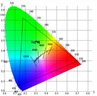 定義您的色域并不簡單。大多數(shù)LED制造商的規(guī)格數(shù)據(jù)中并沒有提供其LED的色度坐標(biāo)。不過,當(dāng)您有了色度坐標(biāo)后,就可輕易標(biāo)出LED在色彩空間中的位置,如圖2所示。圖中系統(tǒng)色域的三角形覆蓋在CIE 1931色彩空間的上面。CIE 1931 色彩空間代表人眼能看到的所有顏色;在色彩曲線外的是波長,此數(shù)據(jù)描繪了色度坐標(biāo)。在這個(gè)圖中,加入了普朗克軌跡(Planckian locus),或?yàn)橐粋€(gè)黑體加上顏色,代表黑體在溫度變化時(shí)在色彩空間的坐標(biāo)。以普通詞匯來說,這坐標(biāo)代表不同種類的白光通過CCT之后的結(jié)果。