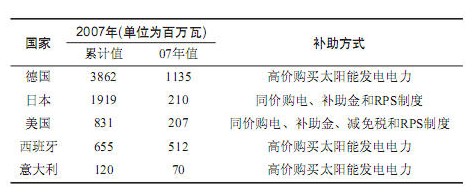 在太陽(yáng)能發(fā)電上領(lǐng)先的歐洲,主要采用電力公司以高于普通電力的價(jià)格購(gòu)買(mǎi)太陽(yáng)能發(fā)電系統(tǒng)所發(fā)的電力。而美國(guó)和日本則采用與普通電力相同的價(jià)格購(gòu)買(mǎi)太陽(yáng)能發(fā)電系統(tǒng)所發(fā)的電力。美、日還補(bǔ)助用戶(hù)購(gòu)置太陽(yáng)能發(fā)電系統(tǒng)。下表列出了幾個(gè)先進(jìn)國(guó)家的太陽(yáng)能發(fā)電的發(fā)電量(單位為百萬(wàn)瓦)和補(bǔ)助措施。