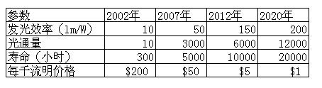 固態(tài)光源OLED目前正處在長期研發(fā)中,美國的技術(shù)進程詳情可見下表