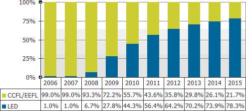 圖一 2006-2015採用傳統(tǒng)CCFL&EEFL燈管與LED背光大尺寸液晶面板出貨比率預測