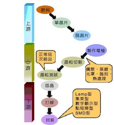 (二)中游:主要產(chǎn)品為晶粒。依LED不同需求進行磊芯片擴散、金屬蒸鍍、再在磊芯片上光罩、蝕刻、熱處理,制成晶粒電極,最后經(jīng)過晶粒切割、測試、檢驗后完成。