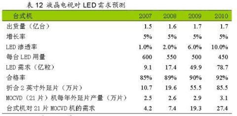 戴爾的這一舉措表明 LED 已經(jīng)不再作為概念機型或者說時尚機型,而是作為標準配置,其價格策略必然不再采取高端策略。戴爾作為行業(yè)內(nèi)的領(lǐng)導(dǎo)廠商之一,其他公司必然跟進。因此2009 年LED 在筆記本的滲透率有望達到20%以上。2007年全球筆記本出貨1.09 億臺,2008年增長15%,2009 年增長10%,則2009 年筆記本出貨1.4 億臺,其中將有2800 萬臺使用LED,對LED 的需求量是70.3 億粒。