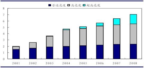 2008年全球LED市場規(guī)模約為69億美元,其中高亮度和超高亮度LED 市場年平均增長率將達到20%左右,市場規(guī)模達16億美元。在移動手機應(yīng)用市場的快速推動下,過去10年高亮度LED市場的年均增長率達到46%。