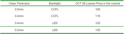 厚度方面目前LED 背光筆記本的厚度也已經(jīng)取得優(yōu)勢,以13.3 英寸白光LED 筆記本面板為例,厚度可以薄40%,重量可以輕20%。受下游筆記本廠商銷售策略影響2008 年LED 普及未達預(yù)期,LED 在各方面都優(yōu)于CCFL,但其價格高于后者。RGB LED 背光比CCFL 背光筆記本面板貴50 至80 美元;白光LED 價格比CCFL高出不到25 美元,但白光LED 對CCFL 優(yōu)勢會打折扣。目前市面上已經(jīng)有多款LED 背光屏筆記本電腦,業(yè)內(nèi)曾經(jīng)預(yù)期2008 年LED 背光板會在NB 中大行其道,不過由于下游整機廠商2008 年仍然把LED 應(yīng)用作為高端機型使用,其價格與普通筆記本的差額遠遠高過使用LED 背光源增加的成本。