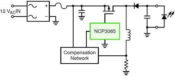 這參考設(shè)計的一項關(guān)鍵考慮因素,是在12 Vac輸入條件下,跨輸入線路變化及輸出電壓變化,實現(xiàn)平坦的電流穩(wěn)流。這參考設(shè)計電路基于安森美半導(dǎo)體的NCP3065構(gòu)建,工作頻率約為150 kHz,采用非隔離型配置。NCP3065是一款單片開關(guān)穩(wěn)壓器,支持12 Vdc或12 Vac電源輸入,設(shè)計用于為HB-LED提供恒定電流。除了NCP3065,這參考設(shè)計還結(jié)合了自動檢測電路。這參考設(shè)計的功能框圖如圖1所示。