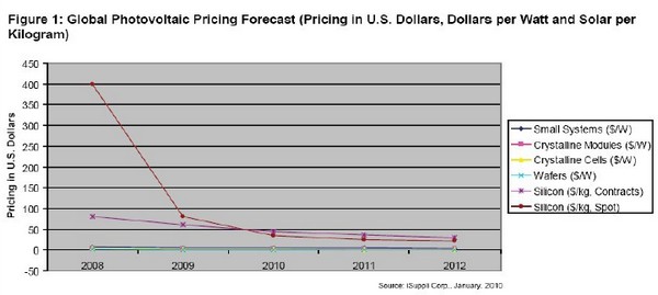 2009 年,光伏系統(tǒng)的平均價格下跌11%左右,而晶體硅組件的平均價格重挫了38%。iSuppli 公司預測,2010 年光伏系統(tǒng)的價格將下降10%,組件價格將再下跌20%。