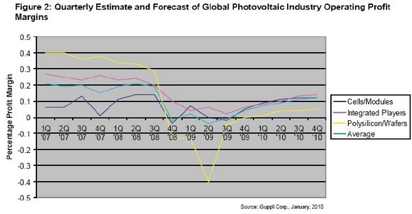 iSuppli 公司的分析結(jié)果顯示,繼2009 年大部分時間虧損之后,廠商在第四季度恢復盈利。預計2010 年獲利情況將繼續(xù)改善,但不會回升到經(jīng)濟衰退之前的水平。iSuppli 公司預測,光伏產(chǎn)業(yè)多數(shù)領域的平均利潤率將在2010 年第四季度前回升到10%以上。但是,供應過剩的多晶硅領域的扭虧步伐將落在后面。驅(qū)動降低成本計劃盈利情況改善的主要因素,是追上價格下跌的速度。