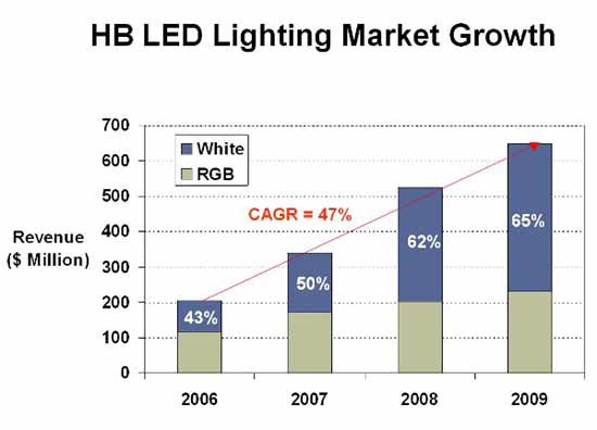 Bob Steele預(yù)計,2010年LED照明市場將會有32%的提升。在未來5年時間里,Bob Steele預(yù)測,替代燈將主宰改造市場,并且新型LED燈具將會出現(xiàn)緩慢增長。他預(yù)測,未來5年,用于照明的LED復(fù)合年均增長率將會達(dá)到44%.