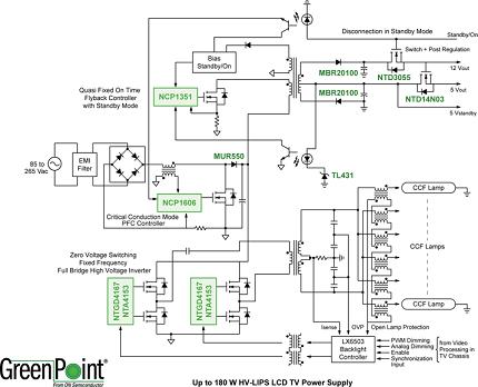 例如,目前市場上銷量最大的是32英寸液晶電視。在這類液晶電視中,采用標準24V逆變器電源的方案在市場上仍占據(jù)多數(shù),但新興的高壓液晶電視集成電源(HV-LIPS)的應用也在不斷增多,總體上呈現(xiàn)出并存的態(tài)勢。采用標準24V逆變器的傳統(tǒng)液晶電視在接受110/220Vac市電輸入后,經(jīng)過整流、PFC及濾波,轉換為200/400Vdc的直流高壓。由于傳統(tǒng)高壓逆變器的輸入電壓要求是24Vdc,故PFC的輸出電壓200/400Vdc會經(jīng)過降壓轉換,產(chǎn)生多路輸出電壓,其中一路24Vdc電壓提供給高壓逆變器,再經(jīng)過DC-AC轉換為超過1,000V甚至達2,000V的交流高壓,去驅動液晶面板的CCFL陣列。安森美半導體為這類傳統(tǒng)液晶電視推出了220W液晶電視電源GreenPoint®參考設計,其中采用的關鍵元器件包括NCP1606CrMPFC控制器、NCP1396諧振半橋控制器及NCP1027待機控制器等。