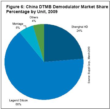 圖6所示為2009年各廠商在中國DTMB解調(diào)器市場的占有率。