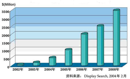根據(jù)全球權(quán)威平板顯示器(FPD)市場調(diào)研和咨詢機構(gòu)DisplaySearch在2004年12月的最新統(tǒng)計(見表2),OLED行業(yè)2004年全年總收入為3.28億美元,比2003年增長了41%。上圖為DisplaySearch2004年2月對全球OLED市場的預(yù)測。
