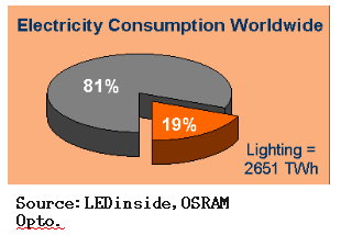依現(xiàn)階段照明占全球電力消耗的比重達19%,耗能總量達到2651 TWH。如果能夠將現(xiàn)有的光源替換成節(jié)能光源,預計將可以省下30%能源消耗。若再進一步將節(jié)能光源與感測器、智能電網(wǎng)等相關應用作結合,預計還可以再節(jié)省30%的能源消耗。 如果到2030年能夠節(jié)省50%的能耗,相當于減少20億桶的石油的二氧化碳排放量。