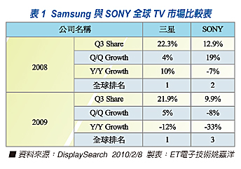 根據(jù)DisplaySearch研究指出,2009第三季全球電視品牌出貨金額排名與市佔率,三星皆為第一名,遠(yuǎn)勝暫居第三的SONY(見圖一),但是就三星現(xiàn)階段的作法來看,三星似乎不滿足,對於OLED TV與3DTV等產(chǎn)品線,三星集團早已極積佈局。而就2010的CES展來看,三星推出65吋的3DTV,其中內(nèi)建3D處理器,可將2D內(nèi)容轉(zhuǎn)換成3D,同時,三星也會推出藍(lán)光播放機,同時支援3D內(nèi)容播放。