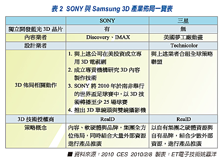 3D的崛起,帶動的不只是視覺體驗的改變,而是集團戰(zhàn)爭的開始,這一點,對於擁有多樣消費性電子產(chǎn)品而言的集團企業(yè)來說,是個機會,也是個挑戰(zhàn),在歷經(jīng)金融風(fēng)暴過後,有的集團逆勢成長,有的卻是節(jié)節(jié)敗退,3D技術(shù)是個再度取得暴發(fā)性成長的好機會,也是力挽狂瀾的最後武器,而三星與SONY就是最好的例子。