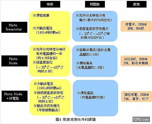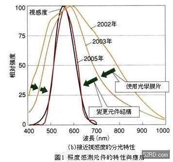 最近幾年照度感測元件(photosensordevice)技術(shù)上的進步,利用分光特性接近人眼視感度度的照度感測元件,可以有效解決上述問題。此外,根據(jù)統(tǒng)計資料顯示,全球照度感測元件潛在市場超過10億個,這包含6億支移動電話與接近近千萬臺的液晶電視,以及車用儀表、顯示器、照明燈具都是適用對象。期盼藉由本文的介紹,提醒業(yè)者降低液晶顯示器制作成本的同時,提高影像品質(zhì)等產(chǎn)品區(qū)隔化技巧也是不可忽略的一環(huán)。