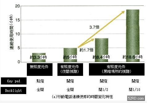 如圖2所示,照度感測元件具備感測夜間戶外只有(Lux;照度單位),乃至于晴天戶外亮度超過的特性,換句話說若能充分應(yīng)用上述特性并作精密控制,理論上可以徹底解決各種電子設(shè)備因光源造成的影像不良等問題。例如照度感測元件可以隨時偵測周圍環(huán)境的光量多寡,自動調(diào)整背光模阻的點燈狀況,進而有效降低可攜式電子產(chǎn)品的電池消費電力(耗電量),同時延長通話與待機時間與電池的使用壽命(圖3(a))。