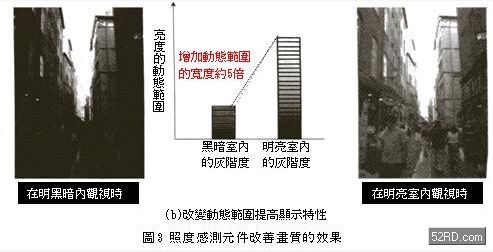 有關(guān)液晶電視的應(yīng)用,主要是液晶顯示器的點燈時間越久消費電力就越大,相對的散熱處理與散熱風(fēng)扇的噪音則變成非常棘手的問題,尤其是目前大型液晶電視的輝度大多超過時,在明亮室內(nèi)畫面非常的亮麗,不過在黑暗室內(nèi)卻會出現(xiàn)波紋現(xiàn)象,而且畫面太亮容易造成眼睛疲勞,黑暗色影像的黑色浮動現(xiàn)象非常明顯,影像對比則大幅降低。由于一般液晶電視是根據(jù)各畫素的液晶穿透率,調(diào)整背光模組的光線達成灰階化顯示目的,然而過多的背光模組光量卻有漏光之虞,如果利用照度感測元件偵測液晶電視視聽環(huán)境的亮度,依此調(diào)整背光模組的輝度,除了影像黑色浮動之外,灰階數(shù)相同的條件下還可以縮小亮度的動態(tài)范圍(dynamicrange),進而提高黑色影像表現(xiàn)能力(圖3(b)),并降低最大輝度解除影像太亮的困擾,這意味著觀賞液晶電視時,消費者不會受到視聽環(huán)境的影響,隨時可以獲得細膩的影像。