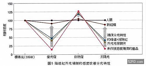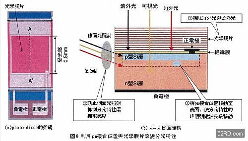 如圖6所示,分光特性可透過照度感測元件結(jié)構(gòu)上的改良獲得調(diào)整,基本上它是改變的接合位置(吸光產(chǎn)生電力),同時配合分光特性的峰值利用光學(xué)濾光片(filter)去除紫外光與紅外光。新日本無線根據(jù)上述動作原理進行分光特性最佳化設(shè)計,再以光罩(mask)遮斷從光二極管側(cè)面入射的光線,藉此捨棄光學(xué)濾光片傳統(tǒng)結(jié)構(gòu);德國OSRAM則採用新材質(zhì)與新結(jié)構(gòu),未使用傳統(tǒng)的改善對策,大幅提升照度感測元件的分光特性。