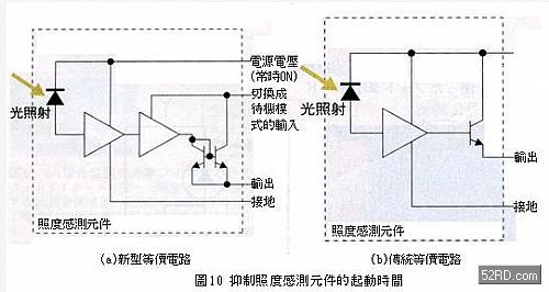由于照度感測元件受光時會消耗電力,因此利用電池驅(qū)動的電子設(shè)備,尤其是可攜式電子產(chǎn)品為抑制電池的消耗電力,所以大多採用間斷式驅(qū)動照度感測元件,然而照度感測元件的電源電壓頻繁的ON/OFF動作,對PhotoIC而言起動時間最少需要,這段期間卻形成所謂的「電力損失」,因此東芝公司針對上述問題,常時對增幅電路施加電壓,同時在增幅電路后段設(shè)置切換電路(圖10),試圖藉此電路縮短起動時間并降低消耗電力,根據(jù)測試結(jié)果顯示消耗電力是傳統(tǒng)元件一半以下。
