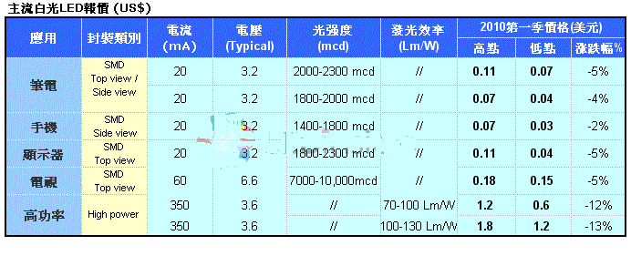 而在照明應(yīng)用的高功率LED部分,則由于亮度在70-90lm/W的供給增多,加上照明市場明顯增溫,廠商為擴(kuò)展市場佔(zhàn)有率,2010年Q1的照明用LED價格跌幅明顯大于背光用LED的價格。