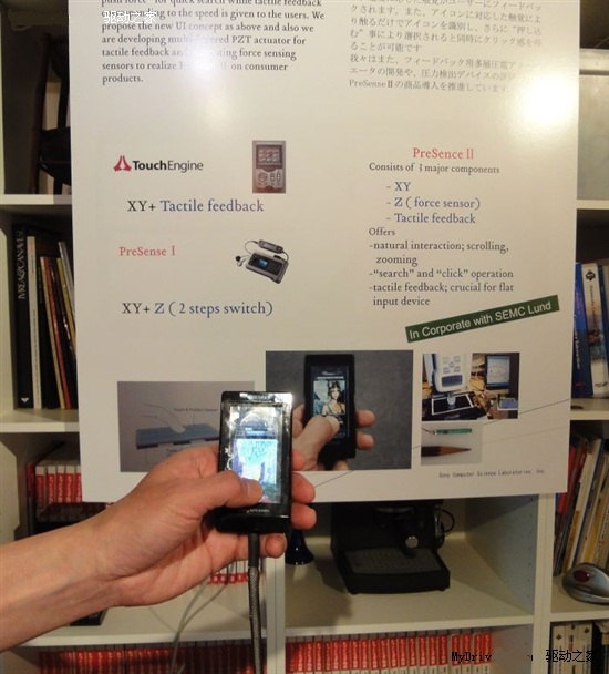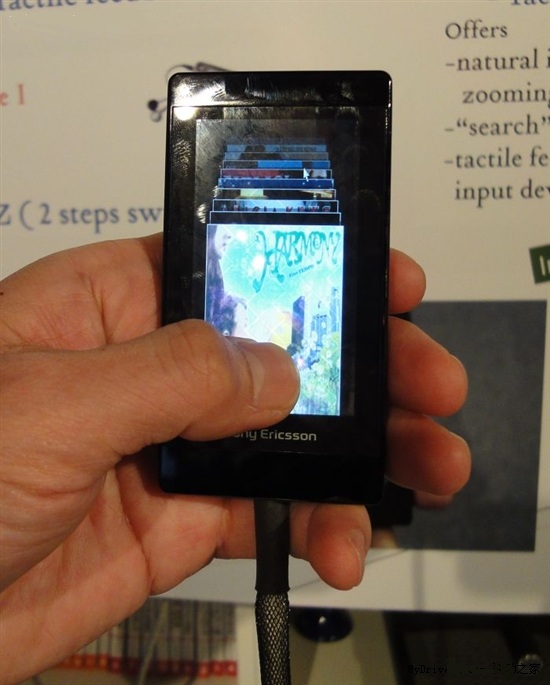 該感壓面板不但能夠偵測(cè)到施加到平面方向(X軸、Y軸)的壓力,垂直于該平面的Z軸方向壓力也可偵測(cè)到。索尼CSL將該面板集成到了索愛(ài)手機(jī)上進(jìn)行演示。根據(jù)演示,手機(jī)上的圖標(biāo)轉(zhuǎn)換速度根據(jù)觸摸壓力的不同進(jìn)行變化,壓力愈大,轉(zhuǎn)換速度就越快。