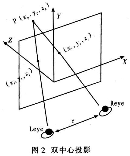 由以上研究可知,立體圖像對的產(chǎn)生是由于左、右眼觀察到的物體透視結(jié)果不同。因此在立體顯示的視景仿真中設(shè)置兩只虛擬的眼睛,一個(gè)獲取左眼的圖像,另一個(gè)獲取右眼的圖像,分別將左右眼的圖像傳送給相應(yīng)的眼睛。因此。在立體顯示中,需要采用包含兩個(gè)視點(diǎn)的透視投影方法一雙中心投影算法。圖2為雙中心投影。