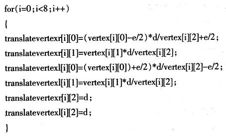 按上述投影算法計(jì)算出立體圖像對后,應(yīng)用OpenGL繪制立體圖像對,分別用紅、綠兩種顏色繪制右眼和左眼的圖像。以一個(gè)變長為10cm,中心點(diǎn)在原點(diǎn)的正方體為例,設(shè)兩視點(diǎn)間距離e為5cm,投影面距高觀察者d為40cm,考察正方體的一個(gè)頂點(diǎn)(5,5,5),由上述投影算法可得:xr=32cm,xl=48cm,yl=yr=4040cm,zr=zl=d=40cm對8個(gè)頂點(diǎn)分別計(jì)算后,連接相應(yīng)的立體透視投影點(diǎn),即可得該立方體的立體圖像對。用數(shù)組vertex[8][3]存儲(chǔ)頂點(diǎn),數(shù)組translatevertexr[8][3]存儲(chǔ)右眼投影計(jì)算后坐標(biāo),數(shù)組translatevertexl[8][3]存儲(chǔ)左眼投影計(jì)算后的坐標(biāo),對相應(yīng)的點(diǎn)進(jìn)行投影計(jì)算: