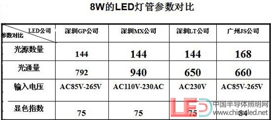 通過上面的表格可以看出,以上我們?nèi)我膺x擇的四家公司的LED燈管的相關(guān)結(jié)果數(shù)據(jù)有的參數(shù)會(huì)有會(huì)有一定的差別,選用LED光源的數(shù)量從144-168顆,光通量也從650-940LM,相差的范圍有290LM之多,輸入的電壓有寬電壓,也有窄電壓。顯色指數(shù)基本在Ra=75左右,國(guó)家LED燈具標(biāo)準(zhǔn)出臺(tái)后會(huì)有一個(gè)標(biāo)準(zhǔn)和規(guī)范。以上為各廠家自行測(cè)試結(jié)果(如上圖所示)