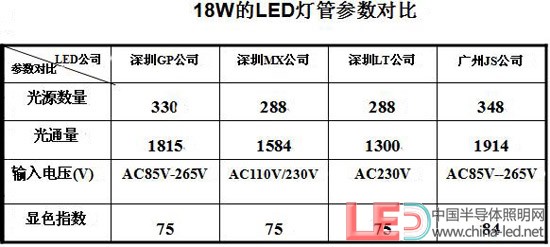 通過上面的表格可以看出,以上我們?nèi)我膺x擇的四家公司的LED燈管的相關(guān)結(jié)果數(shù)據(jù)有的參數(shù)會(huì)有會(huì)有很大的差別,選用LED光源的數(shù)量從288-348顆,光通量也從1300-1914LM,相差的范圍有614LM之多,輸入的電壓有寬電壓,也有窄電壓。顯色指數(shù)基本在Ra=75左右,國(guó)家LED燈具標(biāo)準(zhǔn)出臺(tái)后會(huì)有一個(gè)標(biāo)準(zhǔn)和規(guī)范。以上為各廠家自行測(cè)試結(jié)果(如上圖所示)