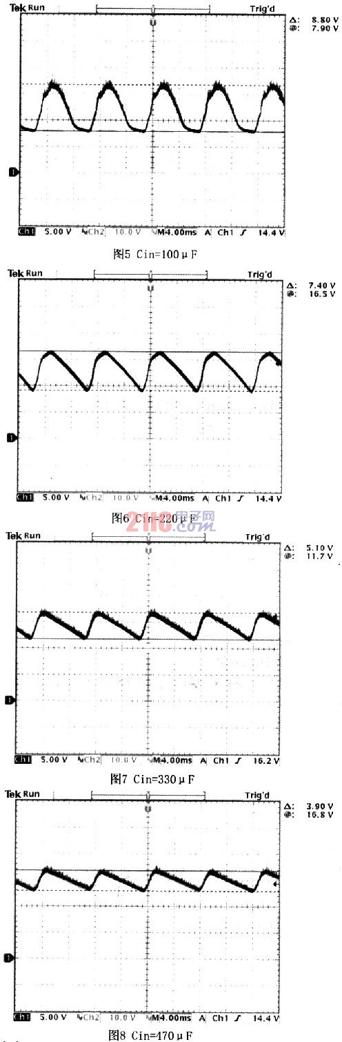 圖5~圖8列出了在不同輸入電容值情況下,輸入紋波Vin:CHl與SW:CH2的變化情形,輸入電容值越大輸入電壓紋波越小,圖5中因為紋波太大,造成Vin最小值剛好等于LED導(dǎo)通電壓,這時候PWM全開,如果電容更小時LED導(dǎo)通電壓不足,造成LED會無法發(fā)亮,圖8中電容用330μF就能讓輸入電壓不會過低。(串聯(lián)3顆1WLED)