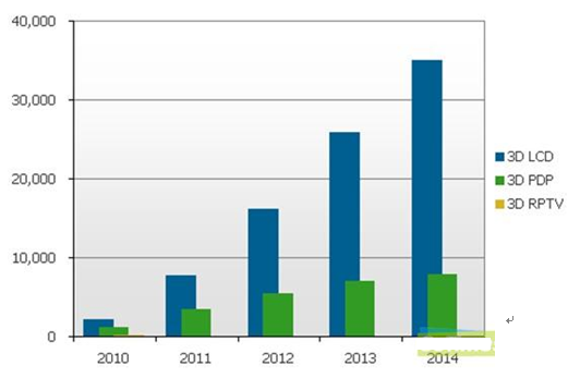 圖一:2010-2014 3D電視按不同應(yīng)用技術(shù)出貨量預(yù)測(cè)(單位:千臺(tái))