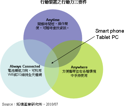 拓墣產(chǎn)業(yè)研究所認為,iPad已改變Mobile PC的定義。以往,只要是尺寸便于攜帶的個人電腦產(chǎn)品就會被歸類為Mobile PC,但現(xiàn)在消費者對于Mobile的要求,已經(jīng)不僅止于能夠「行動」,而必須具備真正能夠隨時隨地使用,滿足消費者需求的「行動力」。