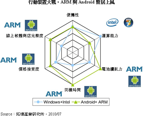 Android除了開放性優(yōu)勢,其在設(shè)計上特別朝向「讓使用者能以最少的點選次數(shù),完成想執(zhí)行的功能」為目標(biāo),正巧滿足了以觸控為輸入方式的平板機。拓墣認為,一個操作簡便、能夠符合ARM處理器運算速度的「小而美」系統(tǒng),才能在Mobile PC被重新定義的年代中異軍突起。而Windows 7在設(shè)計時的考量就與Android不同,但就行動裝置來說,一個運算能力強大的作業(yè)系統(tǒng)并無法滿足平板機及其使用者的真正需求。